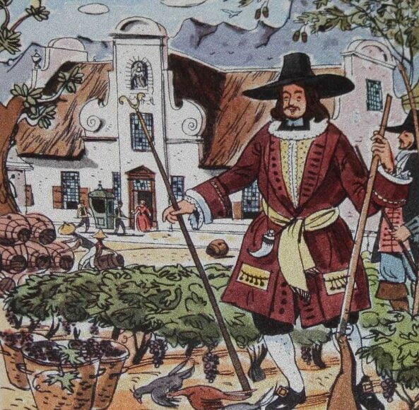 Fu James Van Riebeeck, , il primo governatore del capo, che non aveva competenze in materia di vino, a piantare un vigneto nel 1655, L’intuizione arguta di piantare delle barbatelle che portarono con se dall’Europa, più precisamente dalla Francia, fu giusta: quattro anni dopo, James Van Riebeek , scrisse così nei suoi diari: ” Oggi 2 febbraio 1659, sia lode a dio, le prime uve del Capo sono state spremute“, Riconobbe le potenzialità, le peculiarità vegetative e geologiche del Sudafrica, ma si rese anche conto dei possibili usi del vino nei viaggi, poiché era superiore in termini di durata, nutrienti ed effetti medicinali dell’acqua.